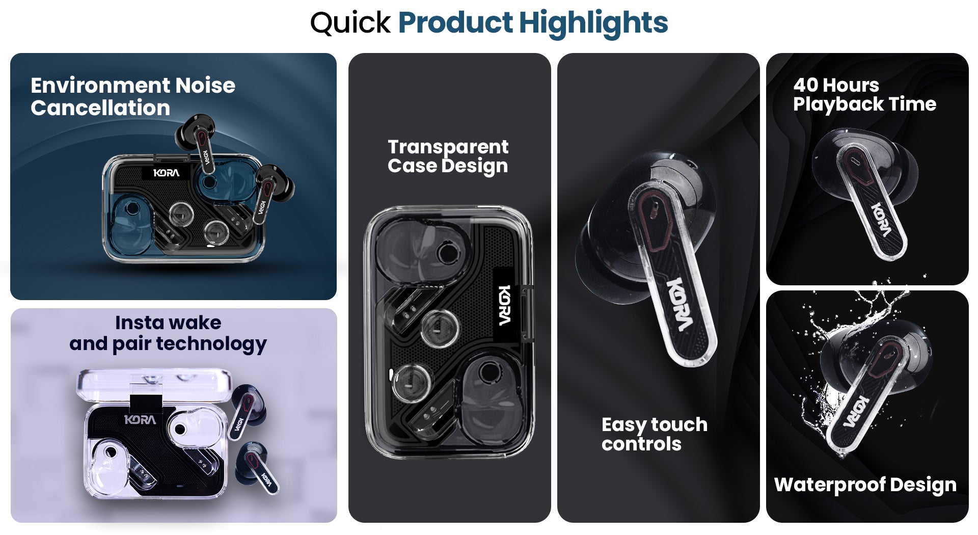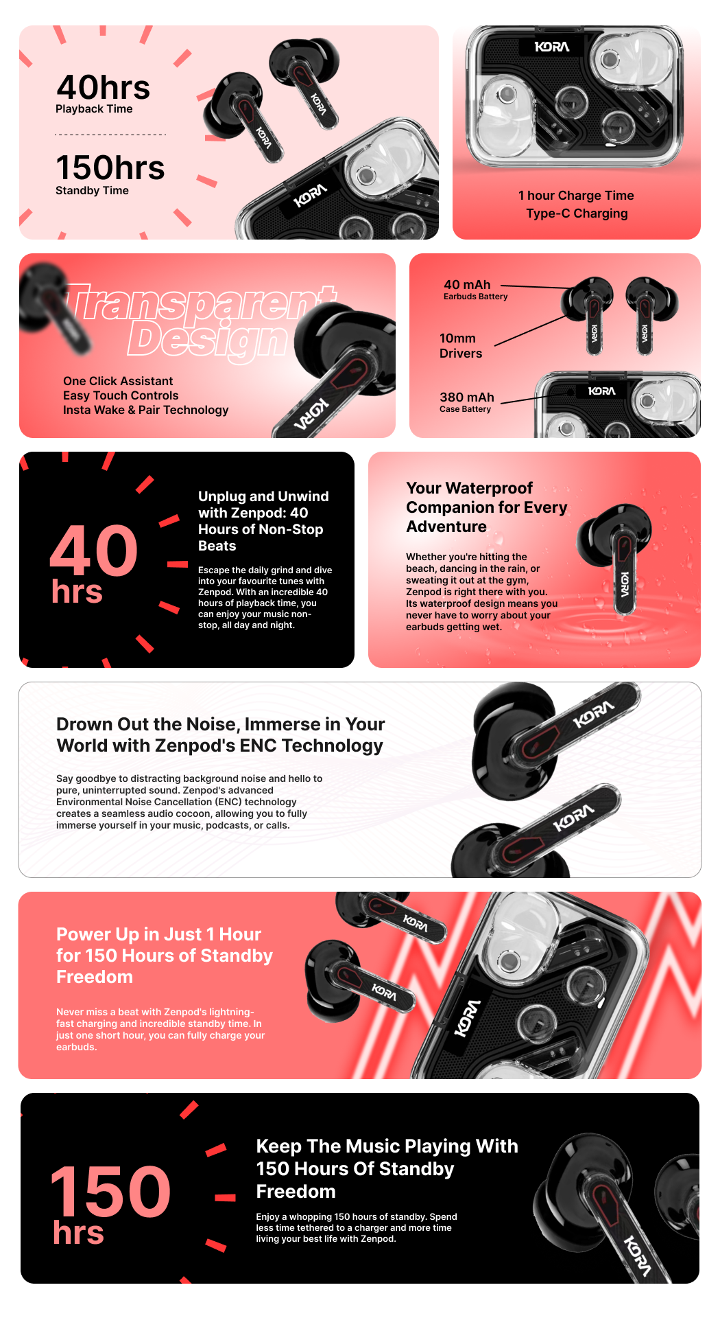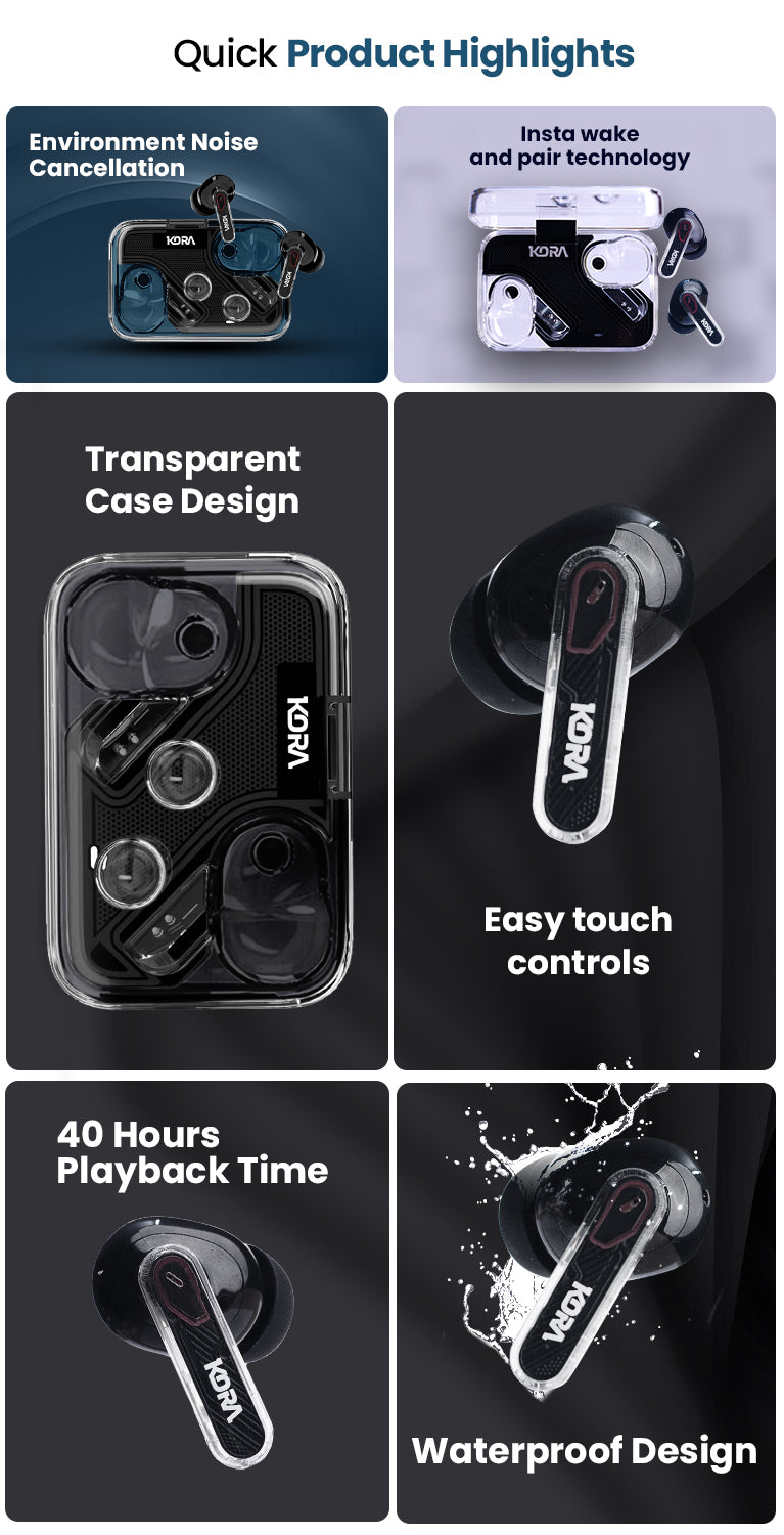 Kora Zenpods Wireless Earbuds with ENC, 10mm drivers, 40 Hours Playback, Type C Fast Charging, Waterproof